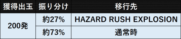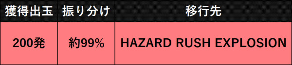 200発獲得可能な大当りで、昇格演出が発生すればHAZARD RUSH EXPLOSION突入!? なお、昇格演出が発生しなかった場合は通常時へ移行する。