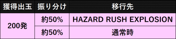 200発獲得可能な2R大当りで、ラウンド終了後はST140回転のHAZARD RUSH EXPLOSIONへ突入する。