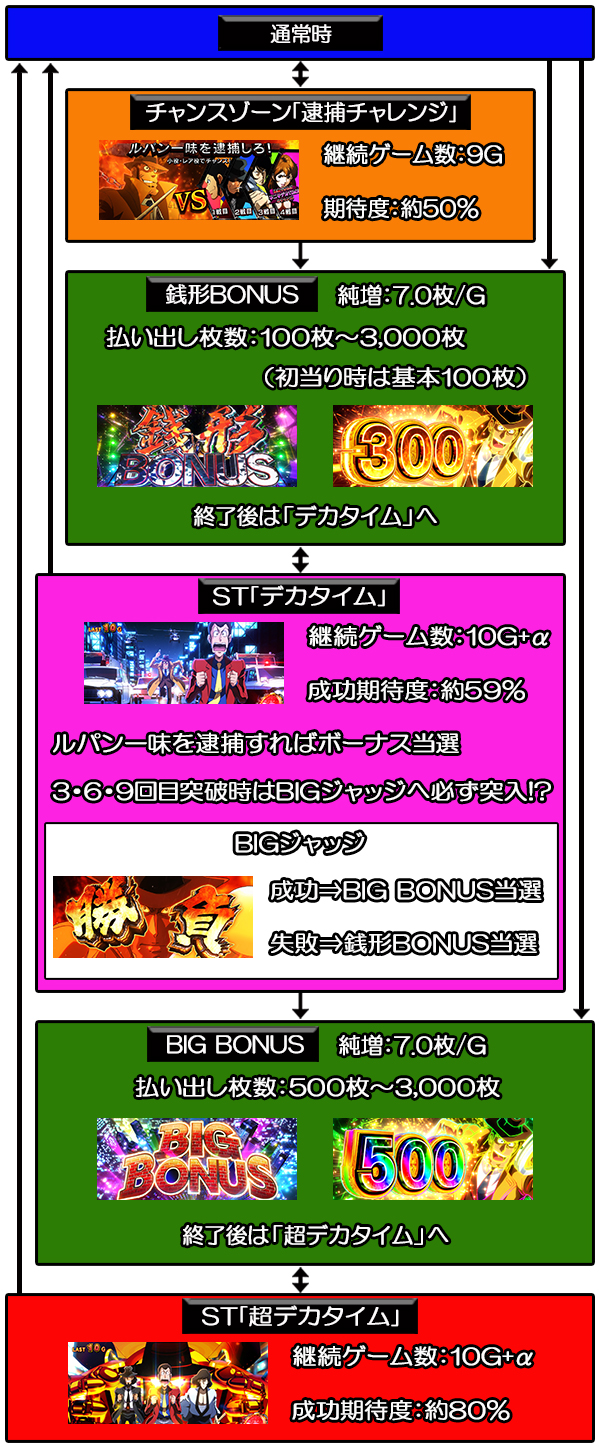 通常時は「捜査ポイント減算からのチャンスゾーン」「規定ゲーム数消化」「デカ目による直撃」の3パターンからボーナス当選を目指す。