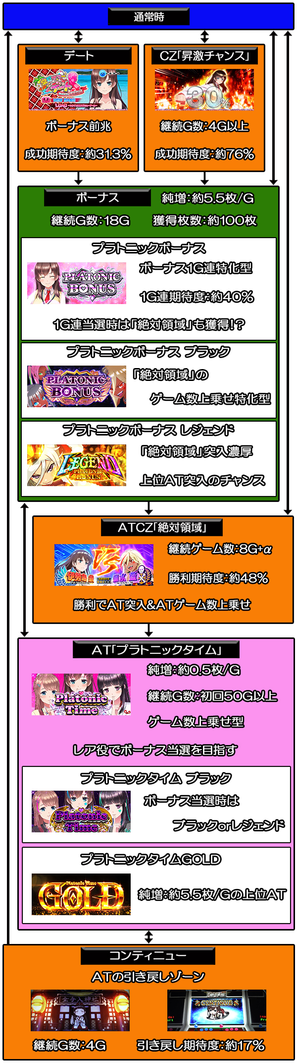 さらに、ボーナス初当り3回ごとに必ず上位ボーナスへ突入するゲーム性や、約5.5枚/Gの高純増でボーナスを目指せる上位AT「プラトニックタイムGOLD」など、新たな衝激が多数存在する。