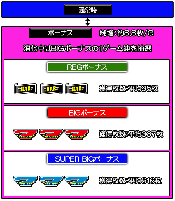 ボーナスは、毎ゲーム抽選やリーチ目役、レア役などにより抽選が行われている。