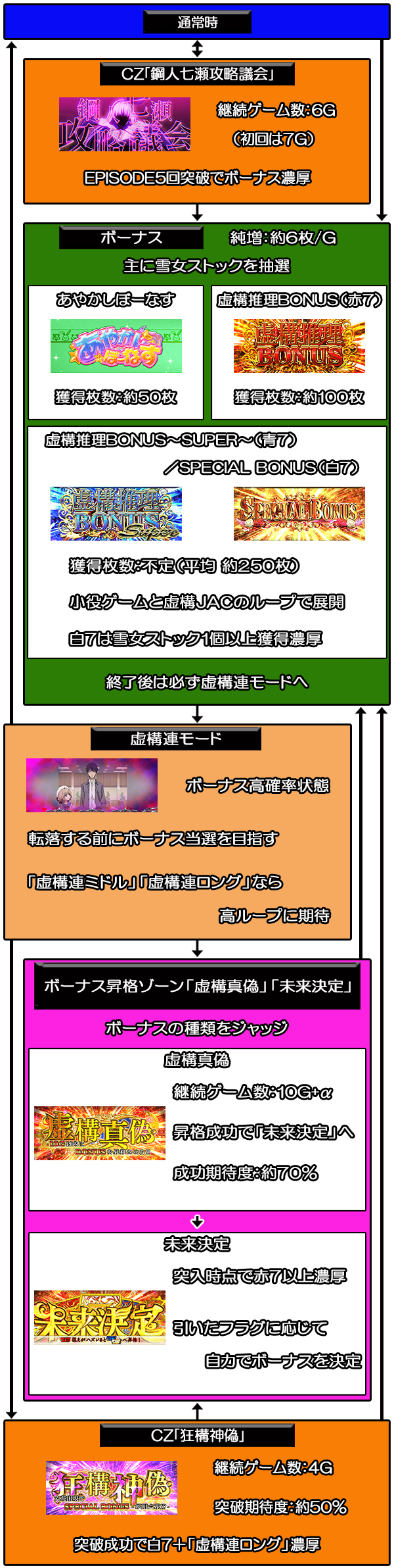 ※通常時からのボーナスは基本的に虚構推理BONUS(赤7)orSPECIAL BONUS(白7)※図は基本的なフローで例外もあり