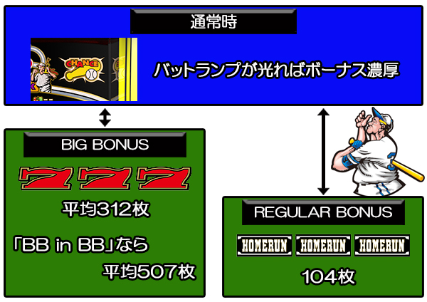 ボーナスは「BIG BONUS」「REGULAR BONUS」があり、BTが発動することで1回のBIG BONUSで平均312枚を獲得できる。さらに、平均507枚獲得可能な「BB in BB」も存在する。