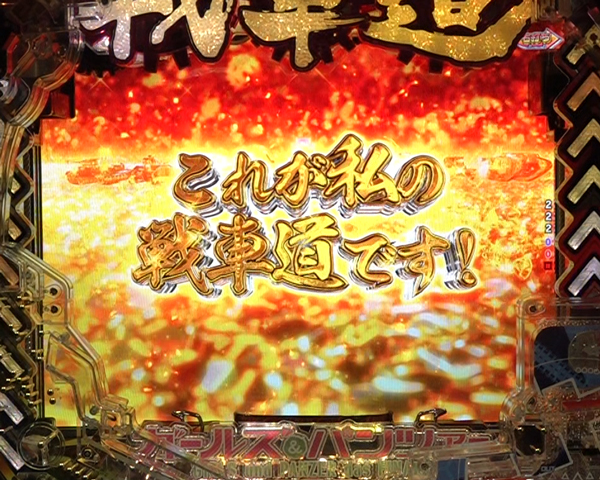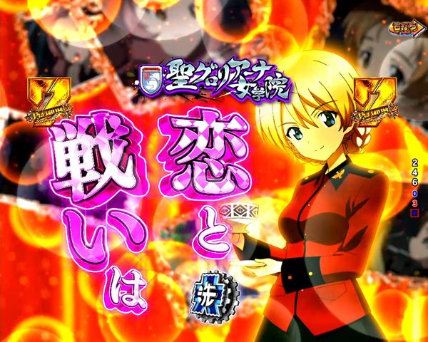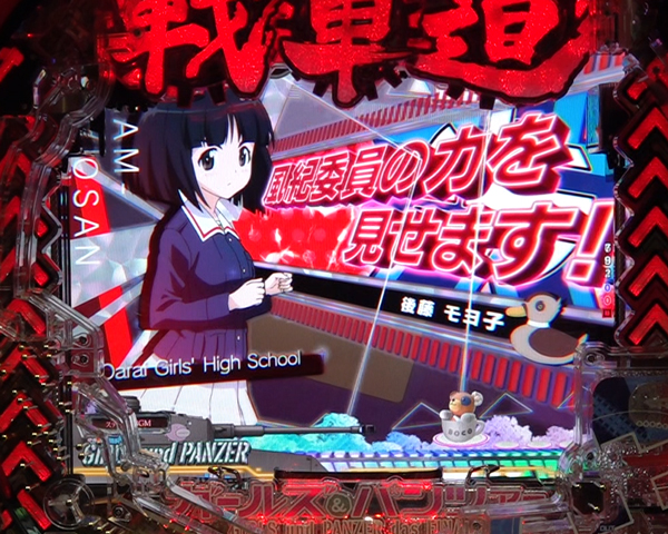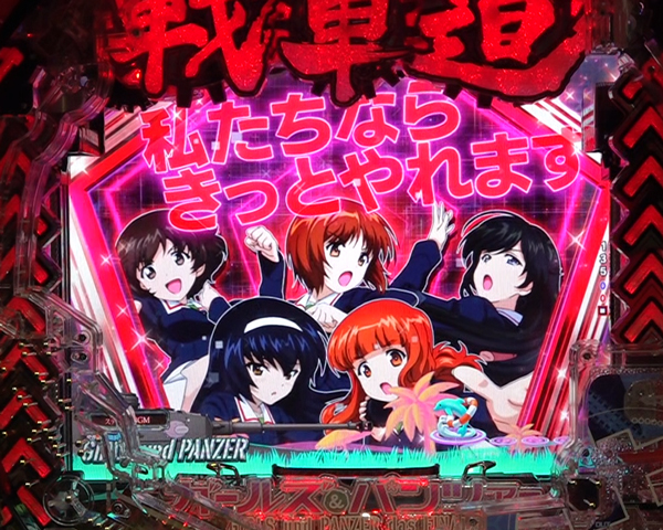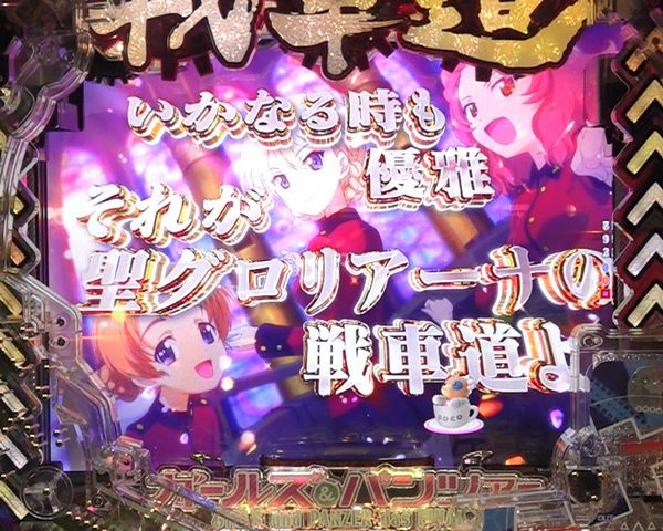 演出 内容 期待度 格言のパターン 恋と戦いは/あらゆることが/正当化されるのよ 19.5% いかなる時も優雅/それが聖グロリアーナの/戦車道よ 92.0% 最も大きな危険は/勝利の/瞬間にある 1,500発以上の大当り濃厚 過去の勝利は/未来の勝利を/約束しない 3,000発以上の大当り濃厚 最終煽り前 人数 1人 21.6% 3人 92.0%