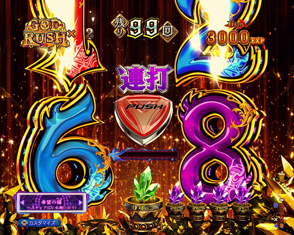 演出 内容 期待度 ダンジョンチャレンジ中 GOD RUSH中 TOTAL 8.3% 26.3% 色保留 点滅 2.9% 11.6% 青色 25.7% 52.0% 緑色 55.2% 71.5% 赤色 95.0% 95.2% 虹色 大当り濃厚 大当り濃厚 違和感保留 回転している 大当り濃厚 大当り濃厚 当該保留のサイズが保留のサイズと同じ 大当り濃厚 大当り濃厚 サイズが微妙に大きい 大当り濃厚 大当り濃厚