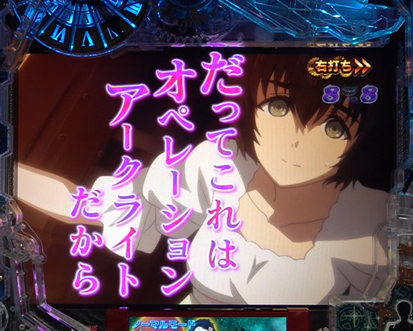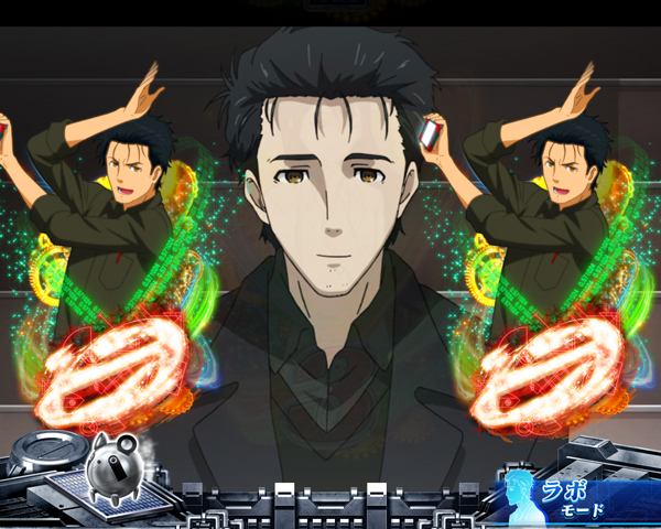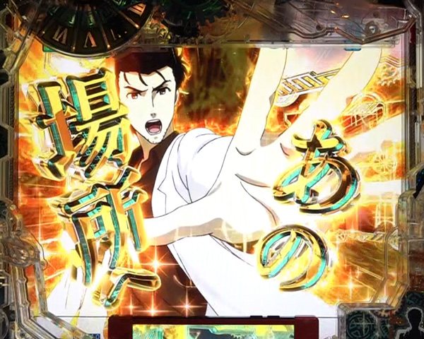 <リーチあおり演出パターン>演出 内容 期待度 煽りパターン デフォルト 15.8% 背景がチャンスアップパターン 76.5% 鳳凰院凶真パターン 95.3% Amadeus紅莉栖パターン 81.9% 結果パターン 失敗 1.5% リーチ成功⇒SPへ 69.0% リーチ成功⇒ボタン即当たり 大当り濃厚 リーチ煽り中に電断⇒執念のエピグラフ(全回転) 10R大当り濃厚