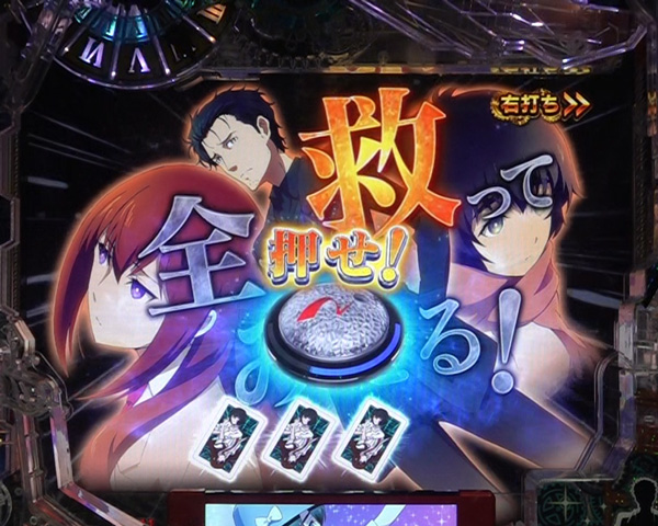演出 内容 期待度 煽りパターン デフォルト 8.4% 背景がチャンスアップパターン 50.9% 鳳凰院凶真パターン 94.3% Amadeus紅莉栖パターン 14.0% 結果パターン 失敗 1.2% リーチ成功⇒SPへ 53.5% リーチ成功⇒ボタン即当り 大当り濃厚