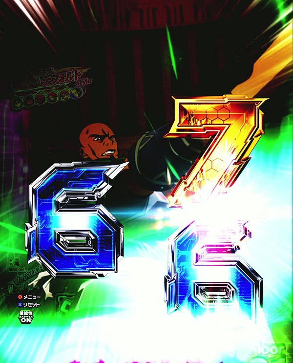 演出 内容 期待度 TOTAL 約12.1% 図柄停止エフェクト デフォルト 約10.6% 赤 約83.8% カットイン 無し 約10.6% 有り 約83.6% 背景 デフォルト 約10.6% 炎背景 約83.6%