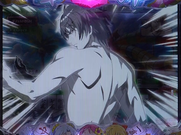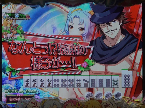 ノーマルリーチ中の猿渡翔打牌時に発生するカットイン予告。カットインの色によって期待度を示唆。