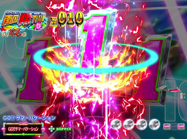 内容 図柄揃い期待度(演出バランス) わいわい シンプル 青色 7% 大当り+南国翔TIME突入濃厚 赤色 86% 大当り+南国翔TIME突入濃厚 金色 大当り+PREMIUM南国翔TIME突入濃厚 大当り+PREMIUM南国翔TIME突入濃厚