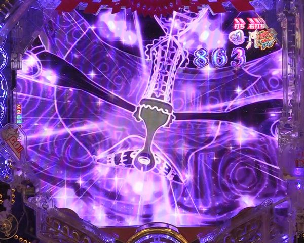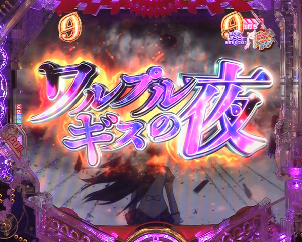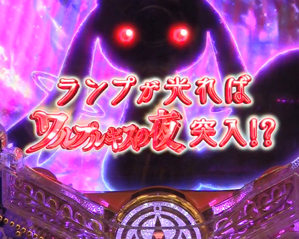 ※リーチ以上の変動で発生。告知なしでテンパイすれば大当り+アルティメット超RUSH濃厚ワルプルギスの夜チャンス告知_紫