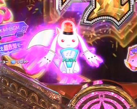 該当する保留の変動開始時にキュゥべえの目が点滅。点滅している間にPUSHボタンを押すとキュゥべえボイスが発生して期待度を示唆する。内容 期待度 君は本当に神になるつもりかい? 大当り+ワルプルギスの夜 さぁ解き放ってごらん ※1 約83.0% どんな奇跡だって起こしてあげられるよ 約55.0% 君なら運命を変えられる ※2 約33.0% 訳が分からないよ 約33.0% きゅっぷい 約5.0% がんばって 大当り濃厚 ※1 ストーリーSPSPリーチ発展濃厚