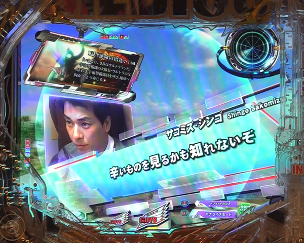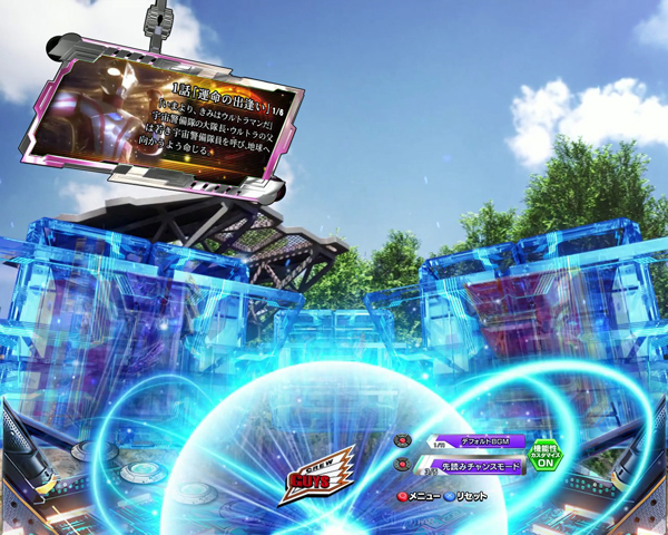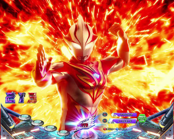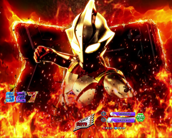<ストーリー発展演出>演出 内容 期待度 停止パネル種類 ストーリーSP RYU:青 約8.0% ストーリーSP 約束の炎:青 約25.0% ストーリーSP MIRAI:青 約10.0% ストーリーSP LEO:青 約40.0% ストーリーSP ULTRAMAN:青 約40.0% ストーリーSPSP 俺たちの翼:赤 約28.0% ストーリーSPSP 仲間達の想い:赤 約28.0% ストーリーSPSP 故郷のない男:金 約80.0% ストーリーSPSP メフィラスの遊戯:金 約80.0% 全回転:虹 大当り+ウルトラメビウスDYNAMITE突入濃厚 -