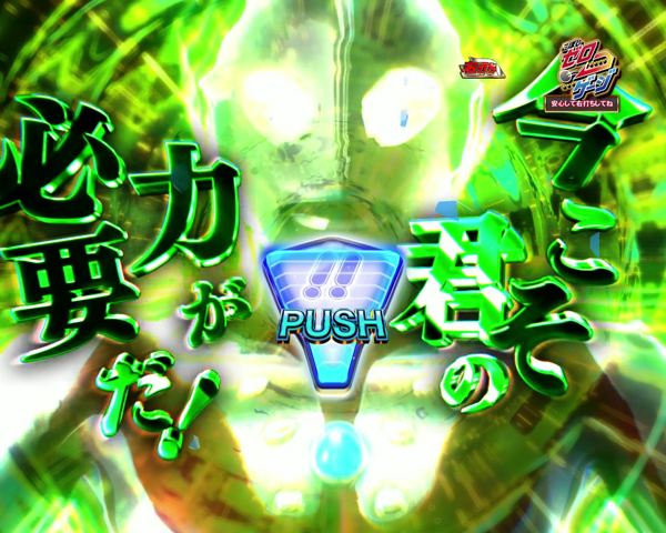 演出 内容 期待度 TOTAL 約25.9% ルート別信頼度 劣勢⇒劣勢 約11.7% 優勢⇒劣勢 約66.0% 劣勢⇒優勢 約90.0% 優勢⇒優勢 大当り濃厚 チャンスアップ種類 BGMがOP曲に変化 大当り濃厚 当落ボタン デフォルトボタン 約21.0% ライジングトリガー 大当り濃厚 裏ボタン押下時 色種類 白 約14.9% 青 約25.9% 緑 約51.2% 赤 大当り濃厚 虹 大当り濃厚