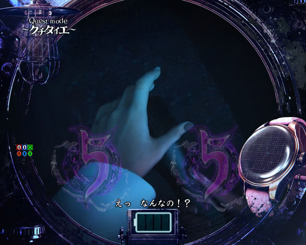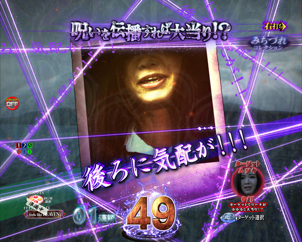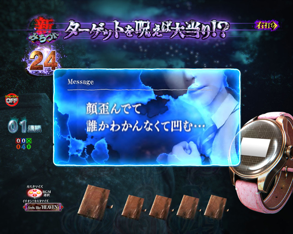 内容 期待度 TOTAL 20.4% 誰かいるの? 14.8% 呪われたの? 14.2% 今のなに? 14.4% 呪いなんて・・・ 14.4% 逃げなきゃ! 35.0% 助けて! 34.3% キットクル! 36.2% 危険すぎる! 図柄揃い濃厚