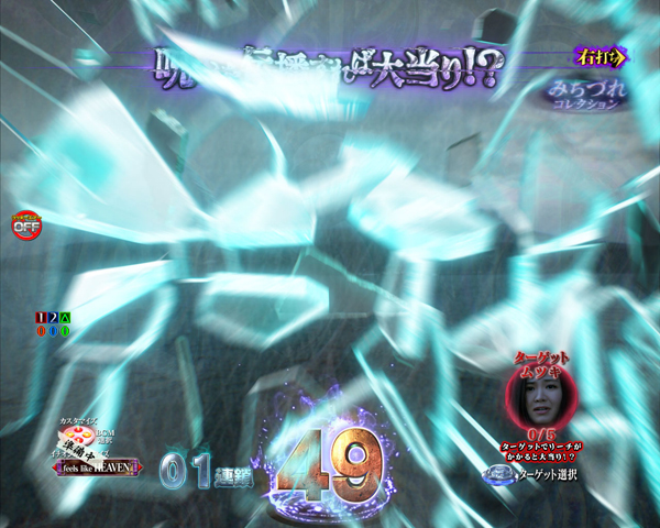 内容 期待度 1でテンパイさせると・・・ 46.9% 2でテンパイさせると・・・ 47.6% 4でテンパイさせると・・・ 49.1% 5でテンパイさせると・・・ 49.4% 6でテンパイさせると・・・ 47.8% 8でテンパイさせると・・・ 49.3% リーチ中に赤い予告が出ると・・・ 3.8% キョウコを追い詰めると・・・ 12.0% カナエをを追い詰めると・・・ 10.8% マリを追い詰めると・・・ 6.1% 智子を追い詰めると・・・ 11.3% 雅美を追い詰めると・・・ 10.8% リカを追い詰めると・・・ 10.7%
