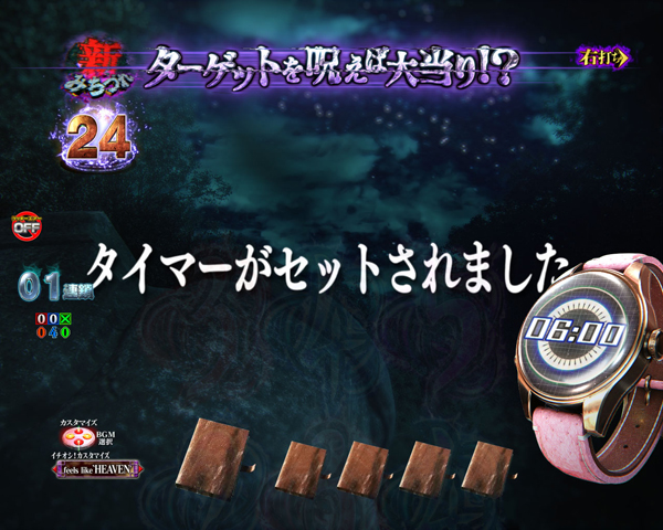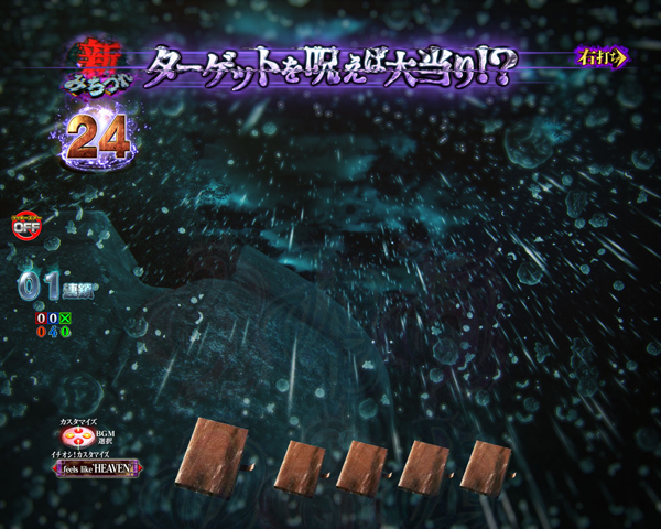 内容 期待度 閲覧注意図柄 20.0% feels like ’HEAVEN’ リーチ図柄 25.0% ラッキーパト図柄 大当り濃厚