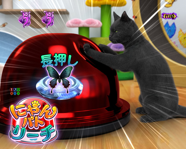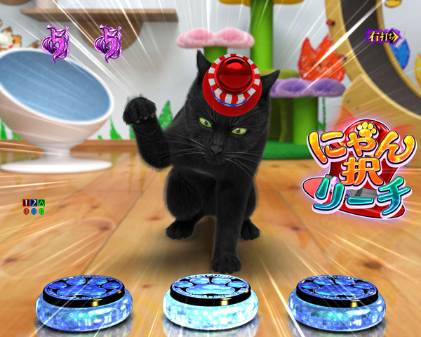 SU1 SU2 SU3 SU4 期待度 顔出してニャア 進む 爪を研ぐ 驚く 21.9% 顔出してニャア 進む あくびをする 驚く 6.9% 顔出してニャア 進む 立ち止まり、上を向く また進む 6.7% 顔出してニャア 進む 立ち止まり、上を向く 驚く 65.0% カプセルを転がしながら登場 割れるか煽り 成功 ー 大当り濃厚