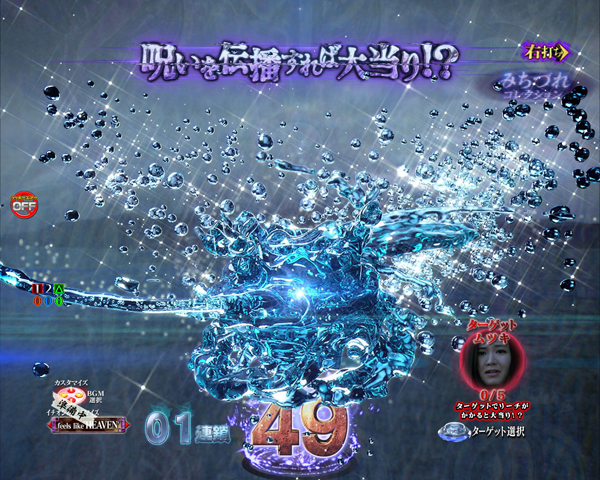 内容 期待度 猫 9.8% 亡魂 13.9% 指をさす男性 30.5% 鏡に映る静子 13.8% 藤丸くん 大当り濃厚