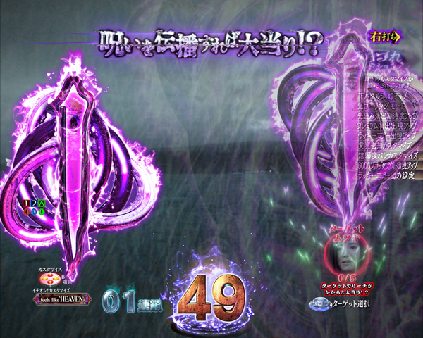 内容 期待度 亡魂中 9.0% 亡魂大 17.8% 亡魂極大 58.3% 緑 4.6% 赤 10.1% 金 59.8% 虹 大当り濃厚