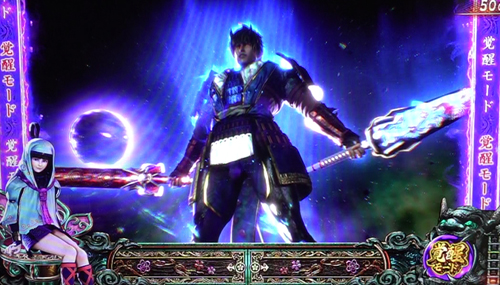 エンディング中のレア役成立時にPUSHボタンを押して発生するボイスで設定を示唆。強レア役成立時は、確定系or否定形のみ出現する。エンディング中のボイス セリフ 示唆内容 蒼鬼「わりぃが さっさとかたづけさせてもらうぜ」 基本パターン 蒼鬼「お前こそ真の鬼武者だ!」 設定5以上 天海「お主の力見せてもらおう!」 奇数設定示唆「強」 ロベルト「主よ この者にご加護を!」 奇数設定示唆「弱」 茜「ここが腕の見せ所だな!」 偶数設定示唆「強」 お初「私…あなたと一緒に生きていく!」 偶数設定示唆「弱」 みの吉「楽しんでるでござるか?」 設定2否定 みの吉「サポートは任せるでござる!」 設定3否定 みの吉「拙者も蒼鬼殿のような侍になるでござる!」 設定4否定 阿倫「あたいはここで見守ってるよ」 設定2以上 阿倫「あんたの力信じるよ!」 設定3以上 阿倫「鬼武者を超えた鬼武者だね!」 設定4以上 エンタライオン「にゃにゃにゃーん」 設定6濃厚 -