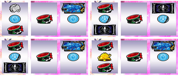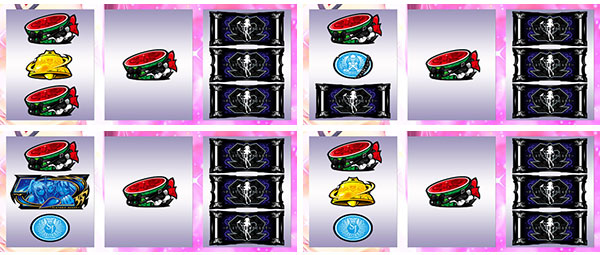 レア役ごとのボーナス当選期待度 小役 当選期待度 弱チェリー・倫役1個停止 34.4% 弱スイカ 8.6% チャンス目・倫役2個停止 48.4% 強チェリー 当選濃厚 強スイカ 71.9% 強ベル・倫役3個停止 当選濃厚