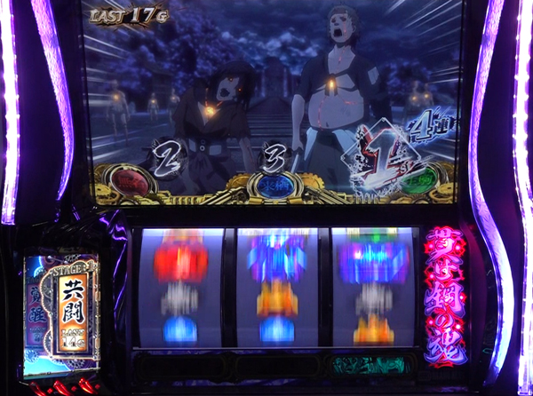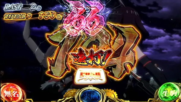 カバネリATTACK中の無名上乗せ発生時は、PUSHボタン連打中に特定のゾロ目枚数が表示されれば高設定濃厚となる。