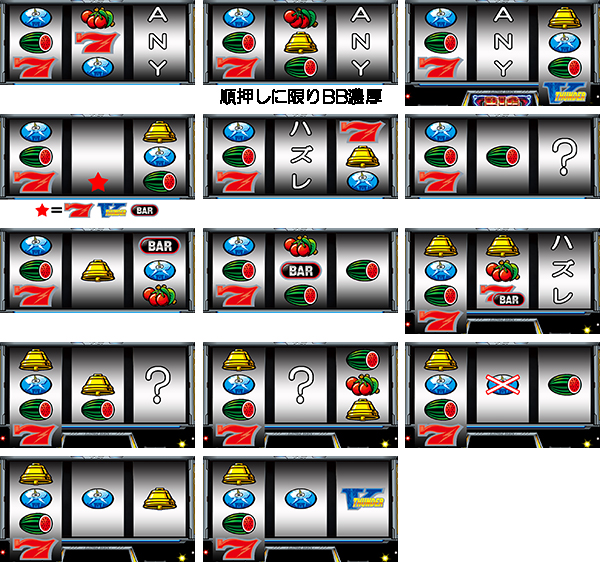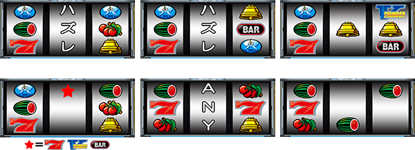 ボーナス一直線や中段スイカハズレの形も出現するリーチ目1枚役 「ベルテンパイハズレ目」「中段ベル揃い」「3連V停止」などが出現 JAC IN 斜めラインにリプレイ図柄が揃い、JAC GAME(BB後半)へ移行する ベル揃い 右下がりにベル図柄が揃う