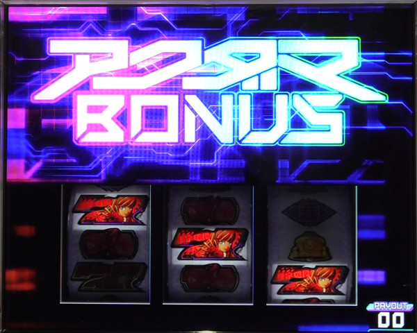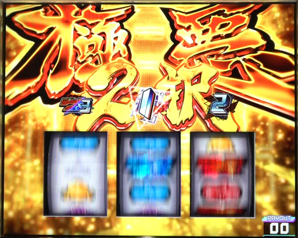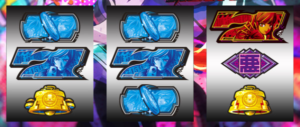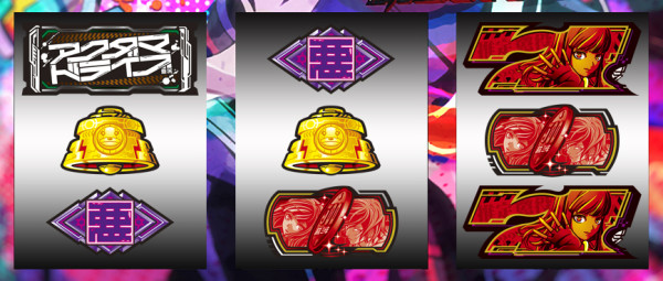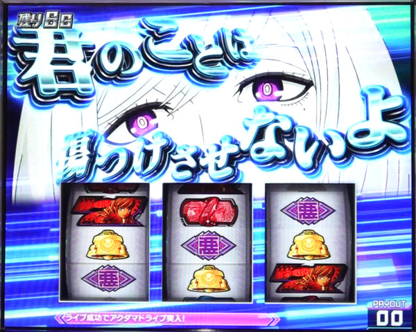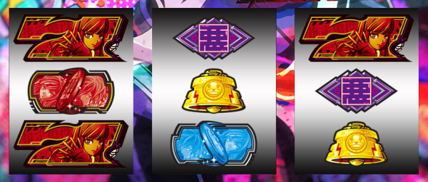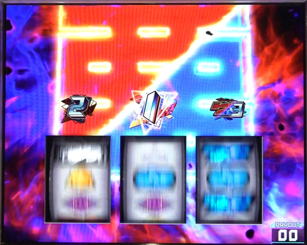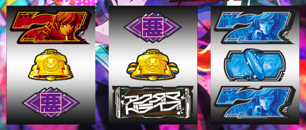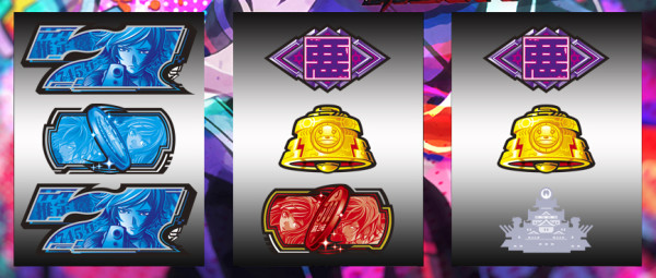 最終リール枠内に赤7図柄or青7図柄を狙い、枠内に7図柄&運命図柄の同色の塊が停止すれば2択成功=アクダマ目停止となる。