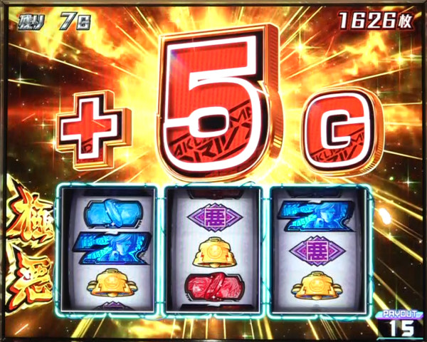 ゲーム数増殖上乗せで展開。30G以上の上乗せが濃厚。