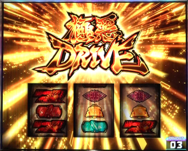 上乗せ特化ゾーン「極悪ドライブ」&上位AT「超S級アクダマドライブ」突入をかけた上位CZ。継続ゲーム数は10G+αで、成功期待度は約67%。