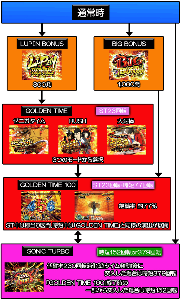 滞在中の大当り後は再び「GOLDEN TIME 100」へ突入する仕様で、継続率は約77%。また、大当り時の50%は1,000発獲得可能な10R確変大当りとなっている。