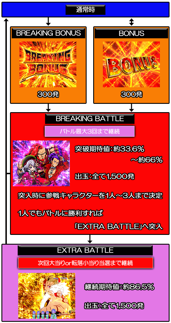 滞在中はバトル勝利でラッキートリガーが発動。1,500発獲得可能な10R大当りの「PREMIUM BREAKING BONUS」を経由して、次回大当りor転落小当り当選まで継続する「EXTRA BATTLE」へ突入する。