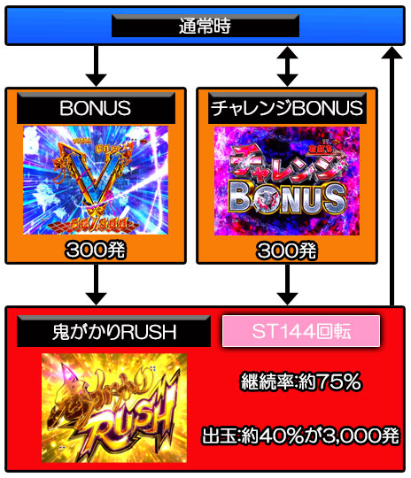 滞在中の大当り後は再び鬼がかりRUSHへ突入する仕様で、継続率は約75%となっている。