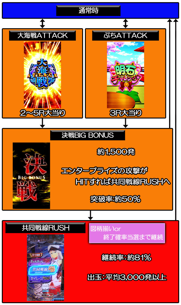 滞在中の図柄揃い(約1/21.9)後は再び共同戦線RUSHへ突入する仕様で、継続率は約81%。また、大当り時は全て平均3,000発以上獲得可能となっている。