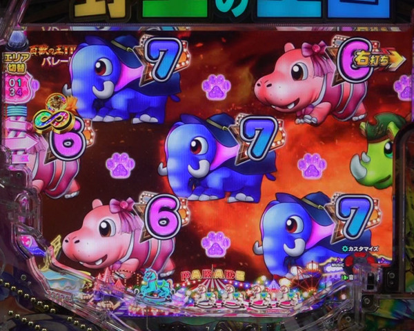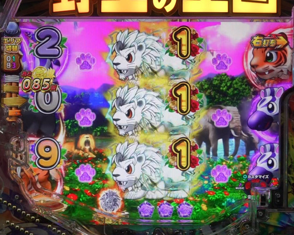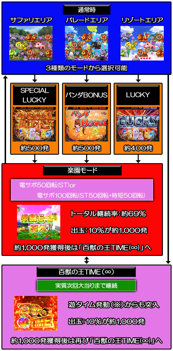 トータル継続率は約69%。大当り時の90%は再び「楽園モード」へ突入するが、10%は約1,000発獲得可能な10R確変大当り後に実質次回大当りまで継続の「百獣の王TIME(∞)」へ突入する。