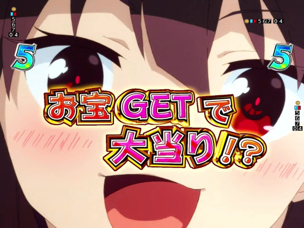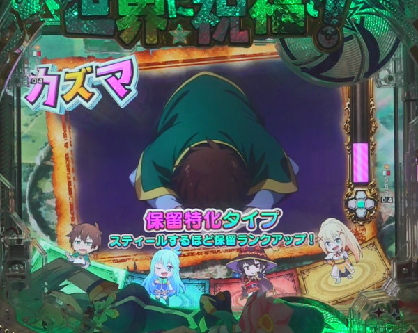 変動中にカズマがスティールで保留をランクアップする。色は青<緑<赤の順にチャンス。また、金なら!?