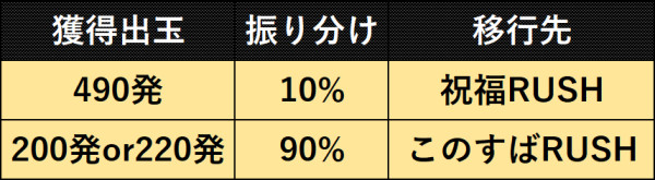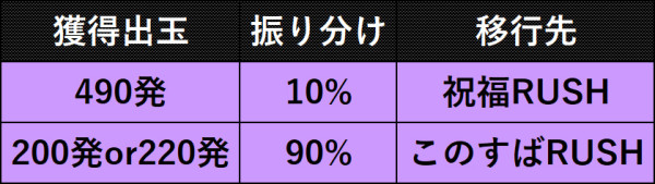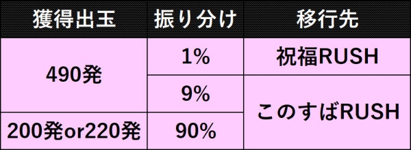 滞在中の大当り後はラウンド数によって移行先が変化。4R獲得時はST33回転+残保留4個の「このすばRUSH」へ、7R獲得時は実質次回大当り濃厚の「祝福RUSH」へ突入する。