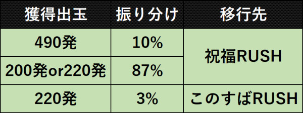滞在中の大当り時は97%の確率で「祝福RUSH」がループ。大当り時は10%が490発獲得可能な7R大当りで、期待値は9,800発以上となっている。