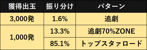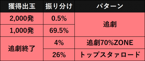 発生時の大当り振り分けは1.6%が2,000発上乗せ+追劇、13.3%が終了後に追劇70%ZONE突入、85.1%がトップスタァロード突入。