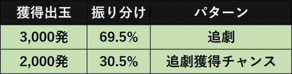 演出で滞在を示唆しており、大当り時は2,000発or3,000発獲得可能。2,000発獲得時は追劇獲得チャンスが発生し、3,000発獲得時は追劇が発生。