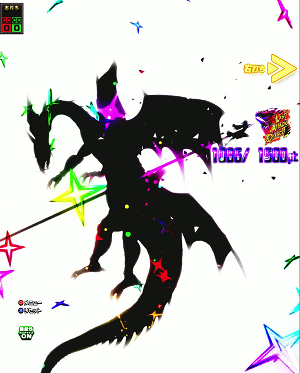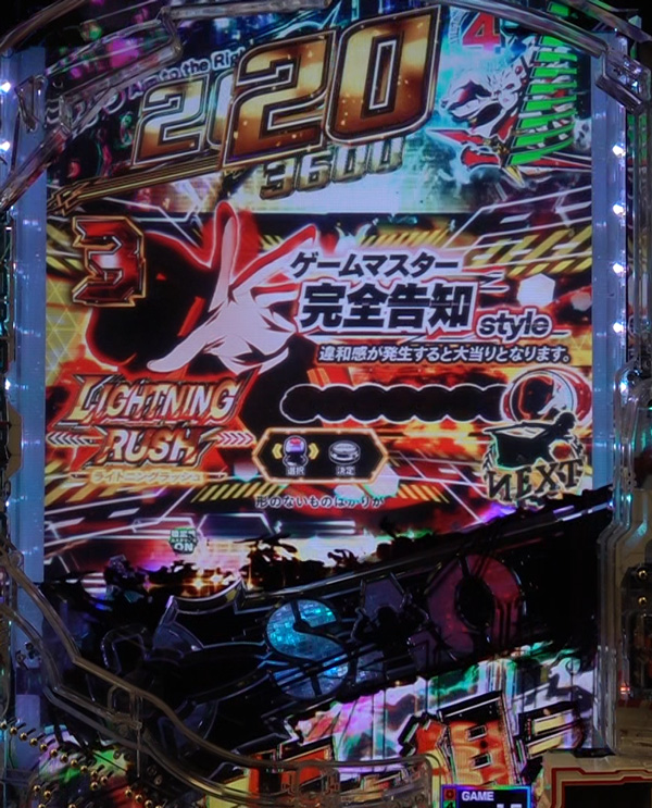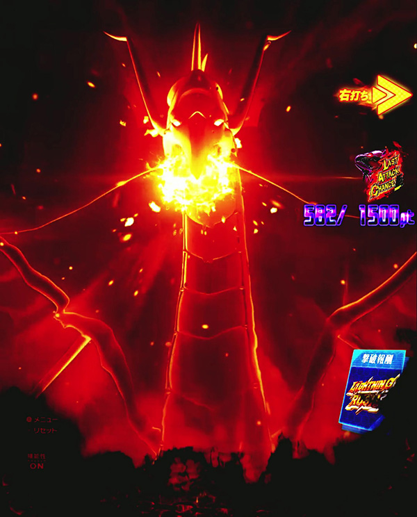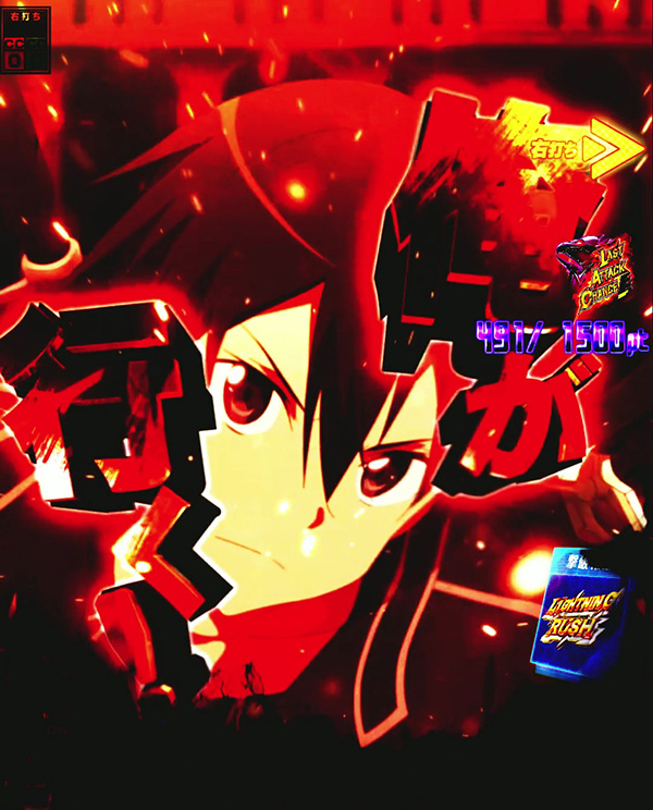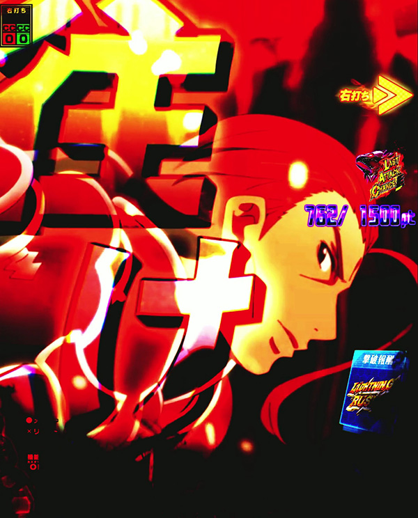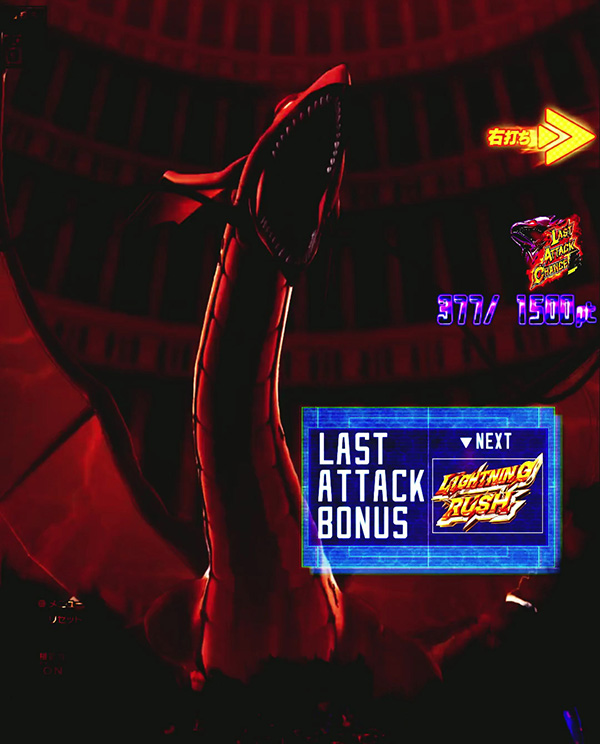 なお、10R大当り時の一部でST77回転+残保留4回or実質次回大当り濃厚の「LIGHTNING RUSH」突入をかけたLAST ATTACK CHANCEが発生する。