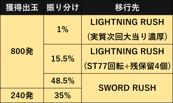 大当り後は基本的に再び「LIGHTNING RUSH」へ突入する仕様で、継続率は約94%。また、大当り時は65%が800発獲得可能な10R大当りとなるだけではなく、大当り全体の33%が実質次回大当り濃厚となる。