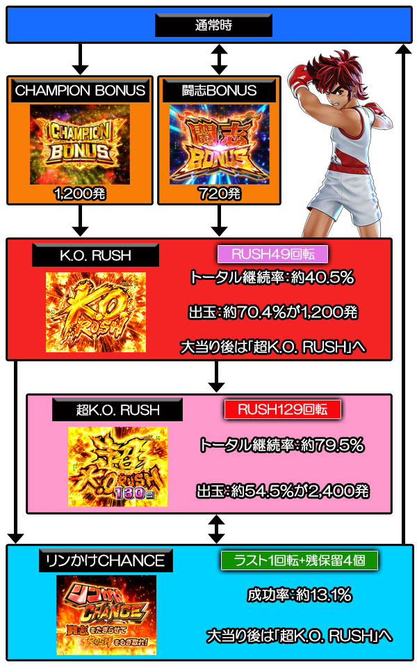 滞在中の大当り後はRUSH回数129回転の「超K.O. RUSH」へ突入する仕様でトータル継続率は約40.5%。また、大当り時は約70.4%が1,200発獲得可能な10R大当りとなっている。