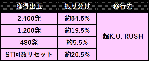 滞在中の大当り後は再び「超K.O. RUSH」へ突入する仕様で、トータル継続率は約79.5%。また、大当り時は約54.5%が2,400発獲得可能となっている。