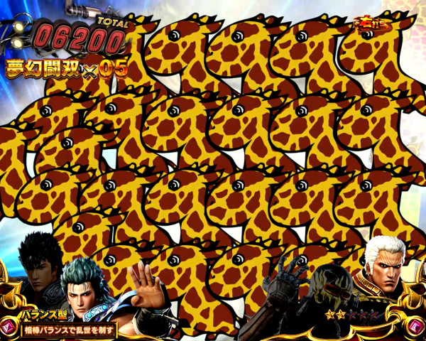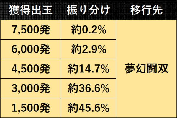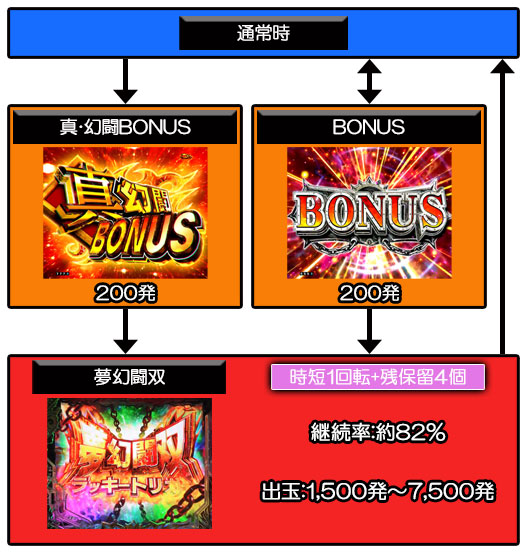 滞在中の大当り後は再び夢幻闘双へ突入する仕様で、継続率は約82%。また、大当り時は1,500発以上獲得可能で最大7,500発獲得可能となっている。