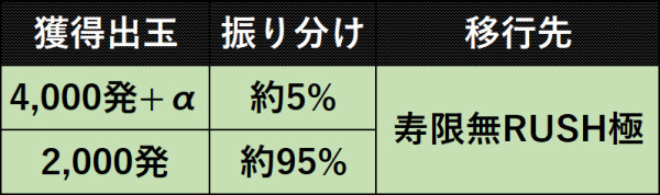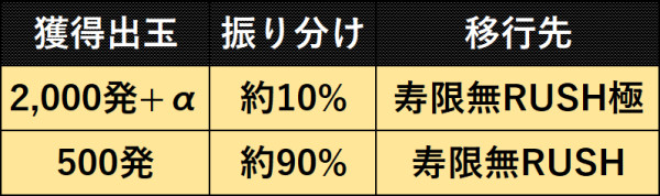 2,000発+α獲得可能な大当りで、終了後は「寿限無RUSH極」へ突入する。