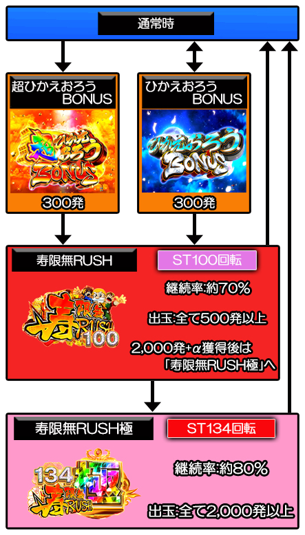 滞在中の大当り後は再び「寿限無RUSH極」へ突入する仕様で、継続率は約80%。