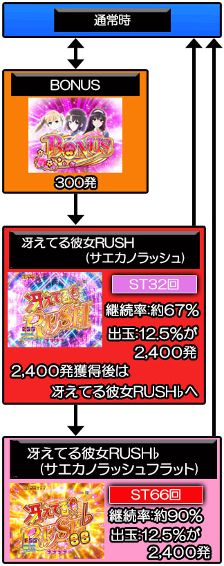滞在中の継続率は約67%で、基本的に大当り後は再び冴えてる彼女RUSHへ突入。また、大当り時は12.5%が2,400発獲得+ラッキートリガーが発動し、ST66回の冴えてる彼女RUSH♭(サエカノラッシュフラット)へ突入する。