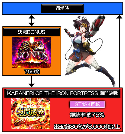 滞在中の大当り後は再び「KABANERI OF THE IRON FORTRESS 海門決戦」へ突入する仕様で、継続率は約75%。また、大当り時は約80%が3,000発以上獲得可能で、6,000発+α獲得可能な振り分けも存在する。